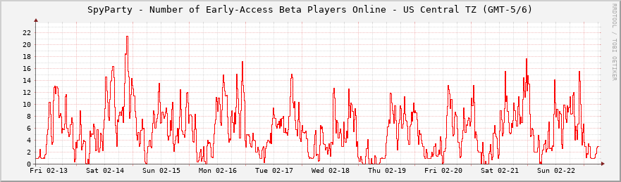 Hi, thanks! 1) There are usually between 2 and 14 people on, depending on when you check. It occasionally dips to zero, but not for more than a few minutes, so you can usually get a game when you want one. Here’s a graph that’s updated automatically: http://www.spyparty.com/spyparty-beta-players.png 2) I’m probably going to add more payments options in the future, but I don’t think it will go below $15 for a single copy (there will be two-for-one discounts and such, like Frozen Synapse, probably).